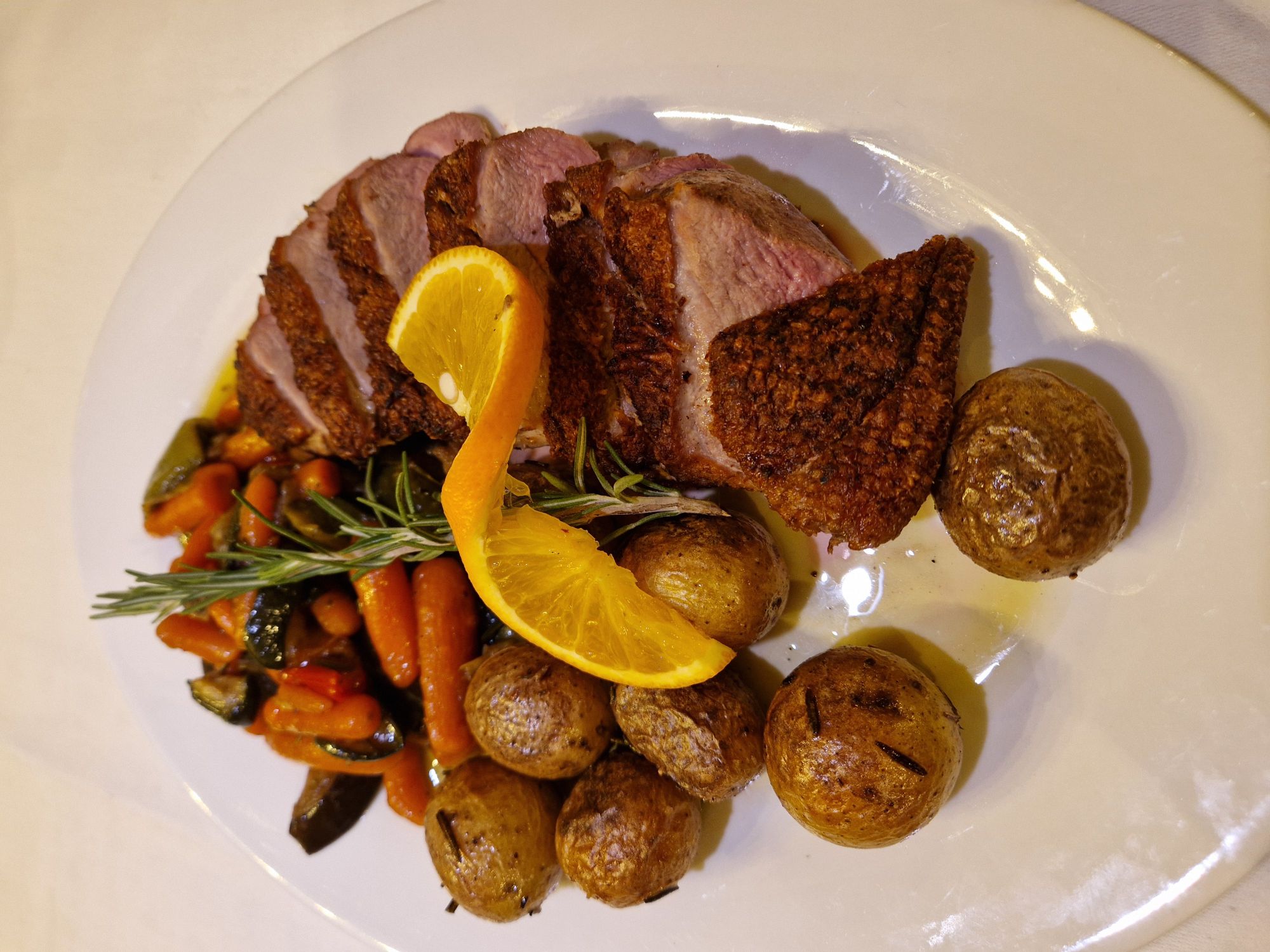 an Orangenlikör-Jus, dazu Rosmarin-Kartoffeln Drillinge und frisches, mediterranes Gemüse