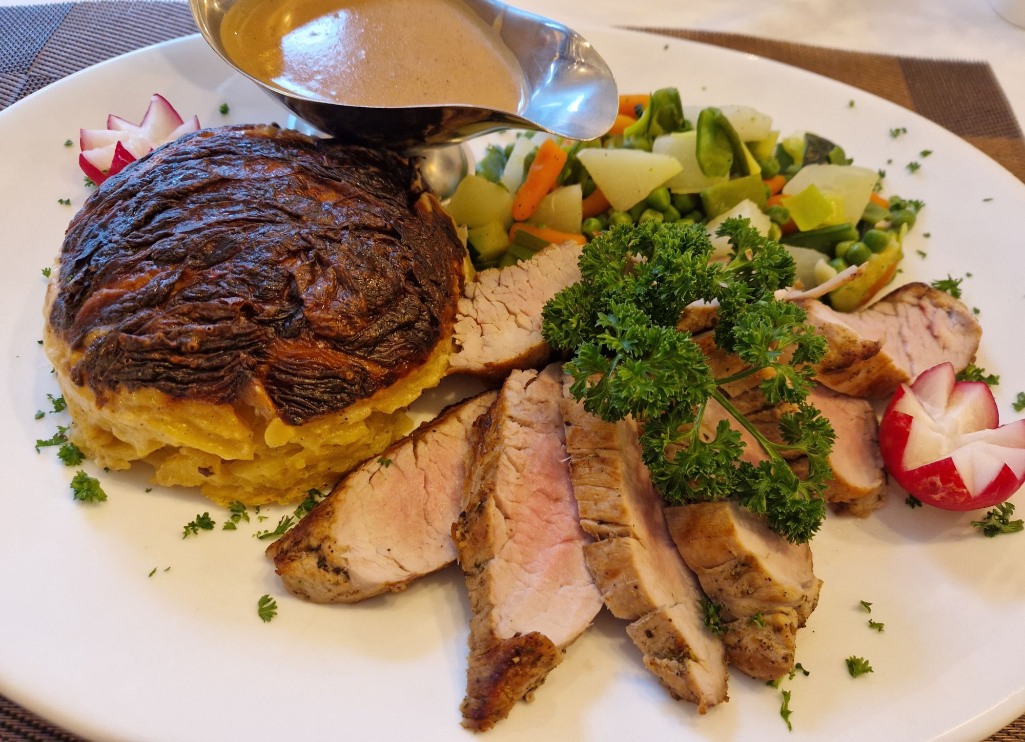 auf Sahnesoße, Kartoffelgratin und Frühlingsgemüse