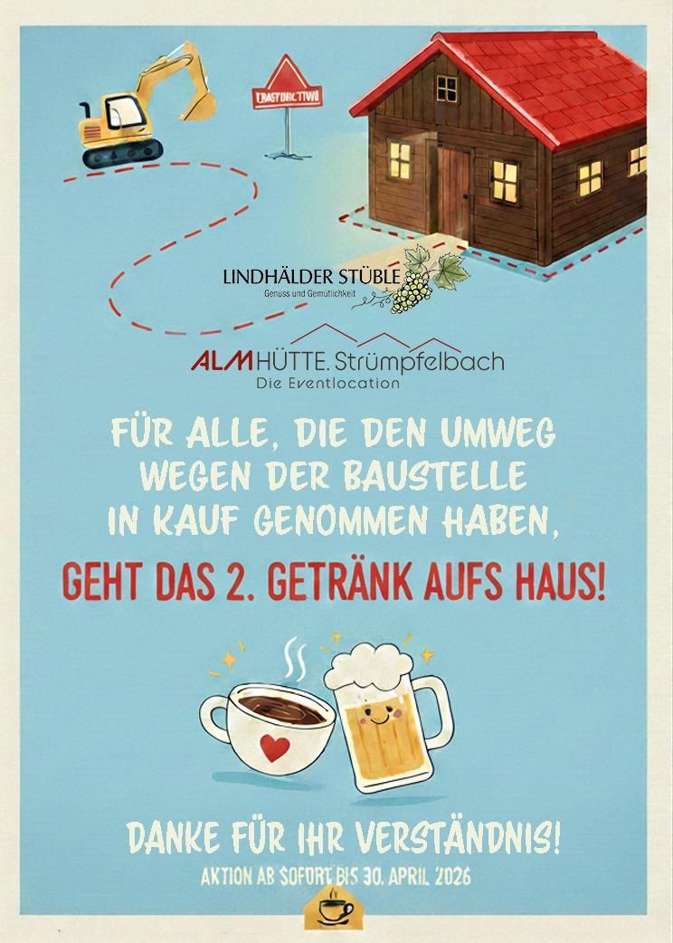 Riesen Umleitung für alle aus Esslingen/Plochingen! Wer sich trotzdem zu uns aufmacht, dem geben wir einen aus!! Herzlich willkommen im Lindhälder Stüble und in der ALMHÜTTE.Strümpfelbach #umleitung #freibier #happyho...